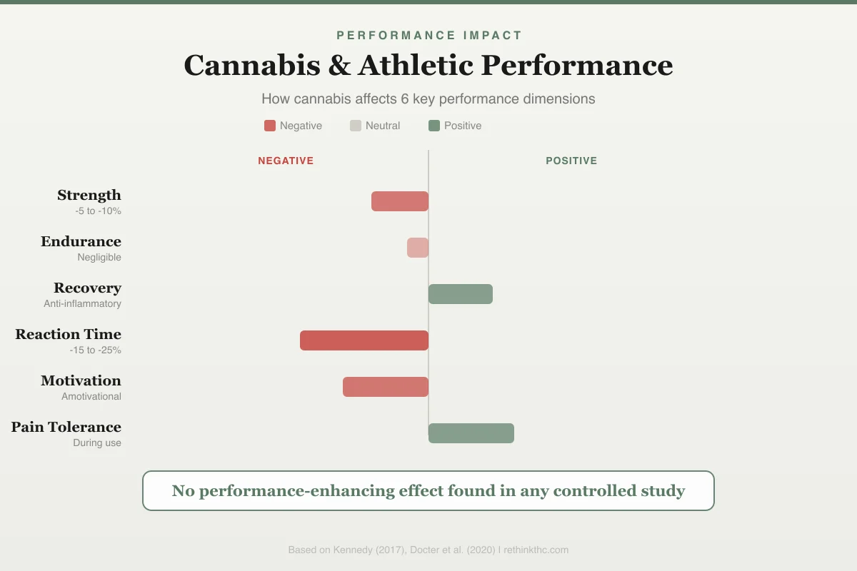 - Cannabis does not improve athletic performance in any measurable way — research shows THC actually impairs reaction time, coordination, and maximal exercise capacity