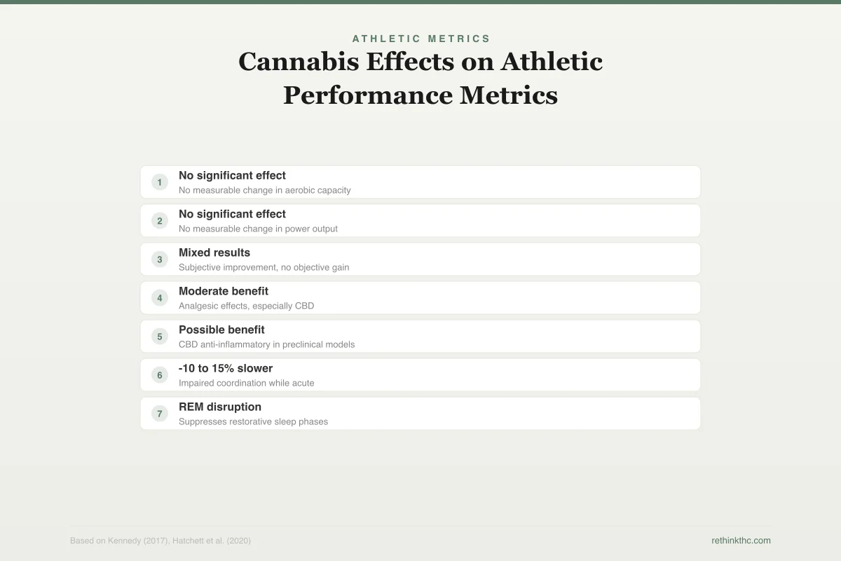 The short answer is no. There is no published research demonstrating that THC enhances any measurable aspect of athletic performance. A 2017 systematic review by Kennedy in the Journal of Science and Medicine in Sport examined the available literature and concluded that cannabis use was associated with impaired exercise capacity, reduced coordination, and slower reaction time.[1]