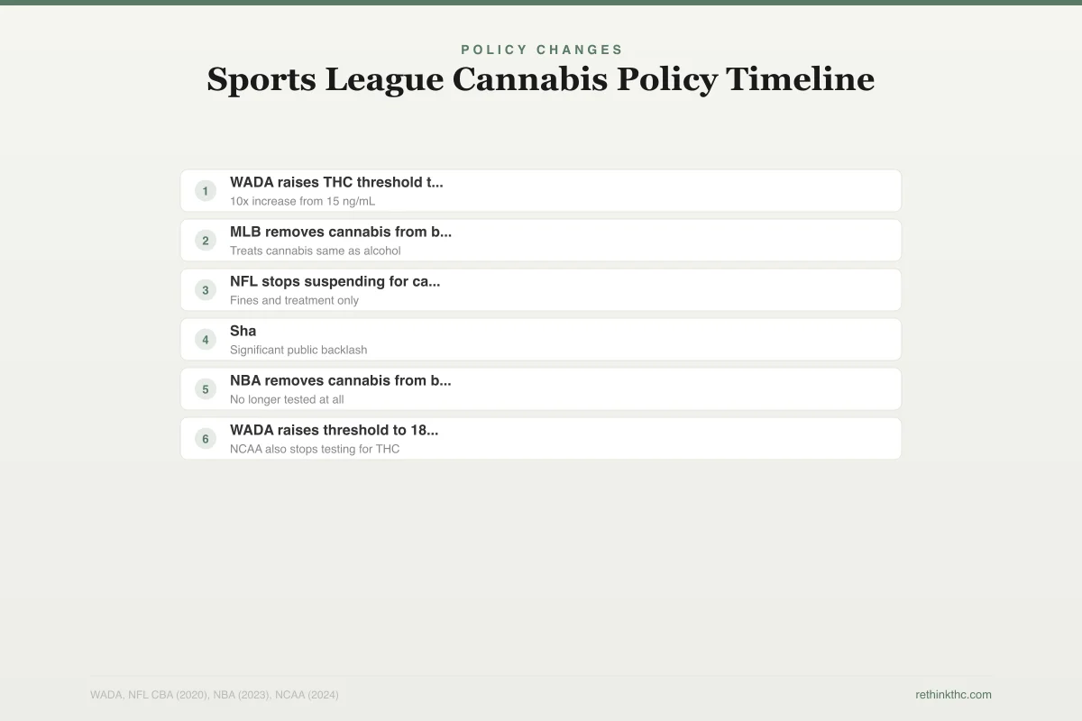 - WADA raised its THC threshold in 2024 from 150 to 180 ng/mL, and the NFL, NBA, and MLB have all softened or dropped cannabis testing and penalties