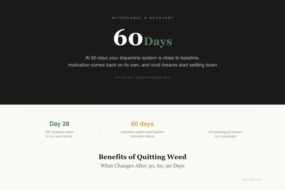 The flatness, the "gray period," the feeling that nothing is interesting. That phase is ending or already over. Your dopamine system has been rebuilding the receptors and sensitivity that THC disrupted, and by day 60, most people report that everyday activities feel rewarding again.