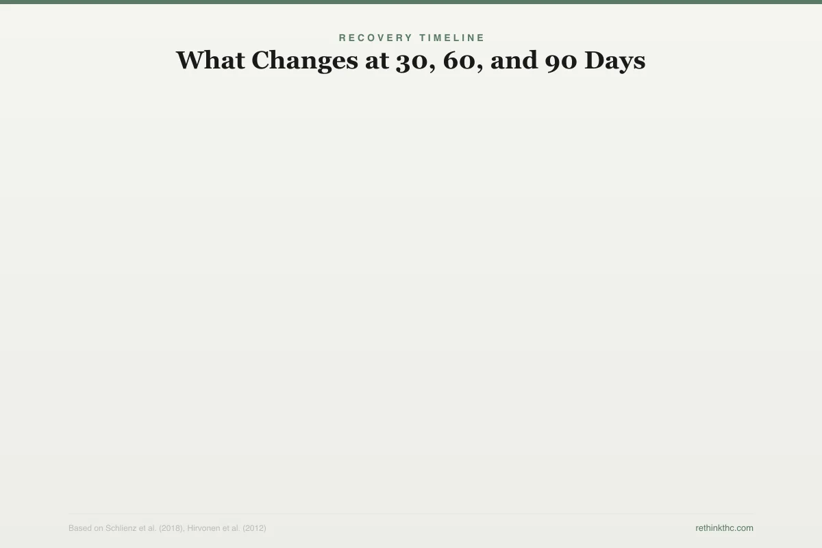 The Hirvonen 2012 study[1] found that CB1 receptor density returns to normal levels by approximately day 28. These receptors regulate mood, appetite, pain perception, and sleep, among other functions. When they normalize, the systems they govern start working properly again. This single finding explains why so many people describe the end of the first month as a turning point.