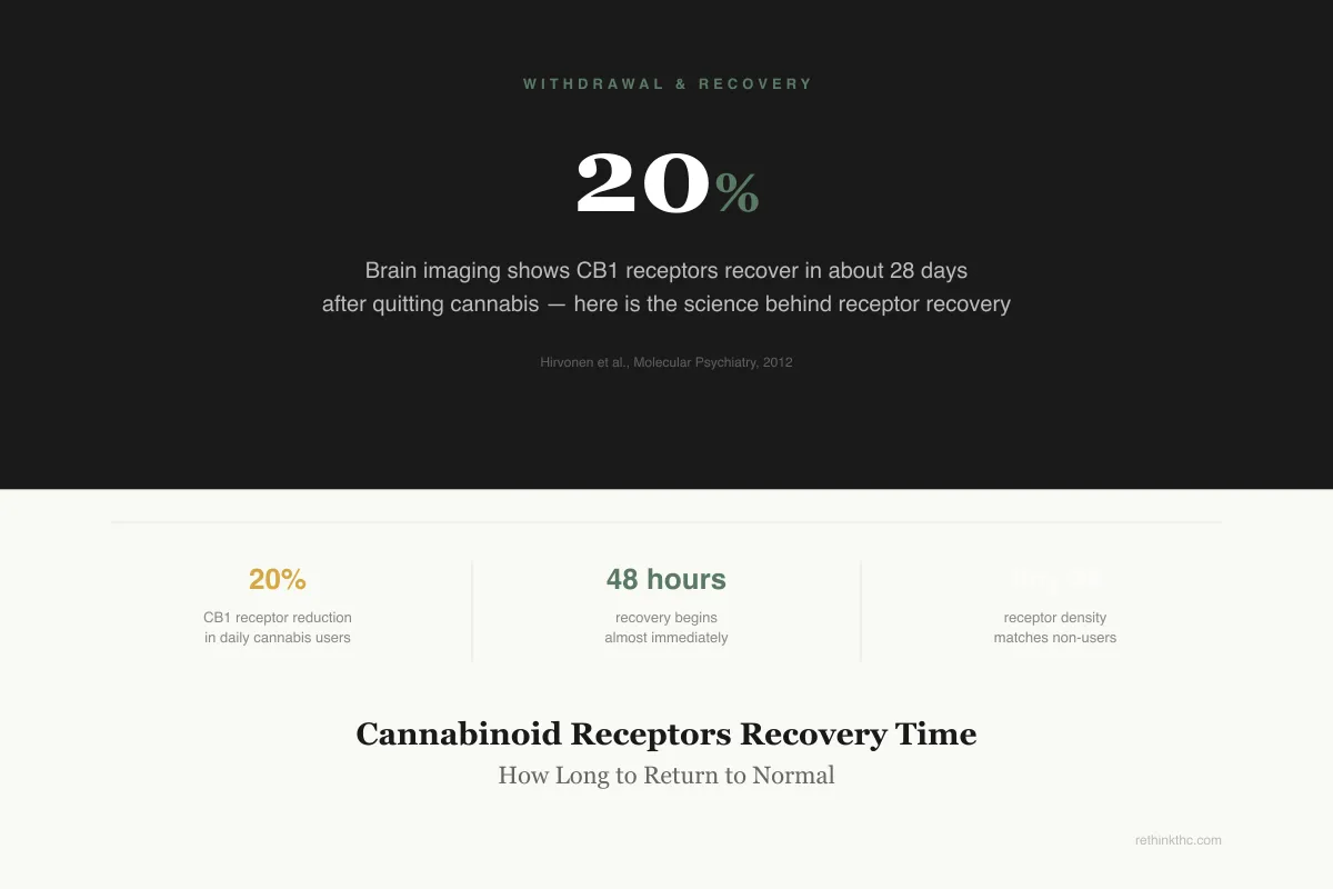The gap: CB1 receptors may normalize by day 28, but downstream systems (dopamine, emotional regulation) take 6–12 weeks to fully recalibrate. Receptor recovery ≠ feeling normal.