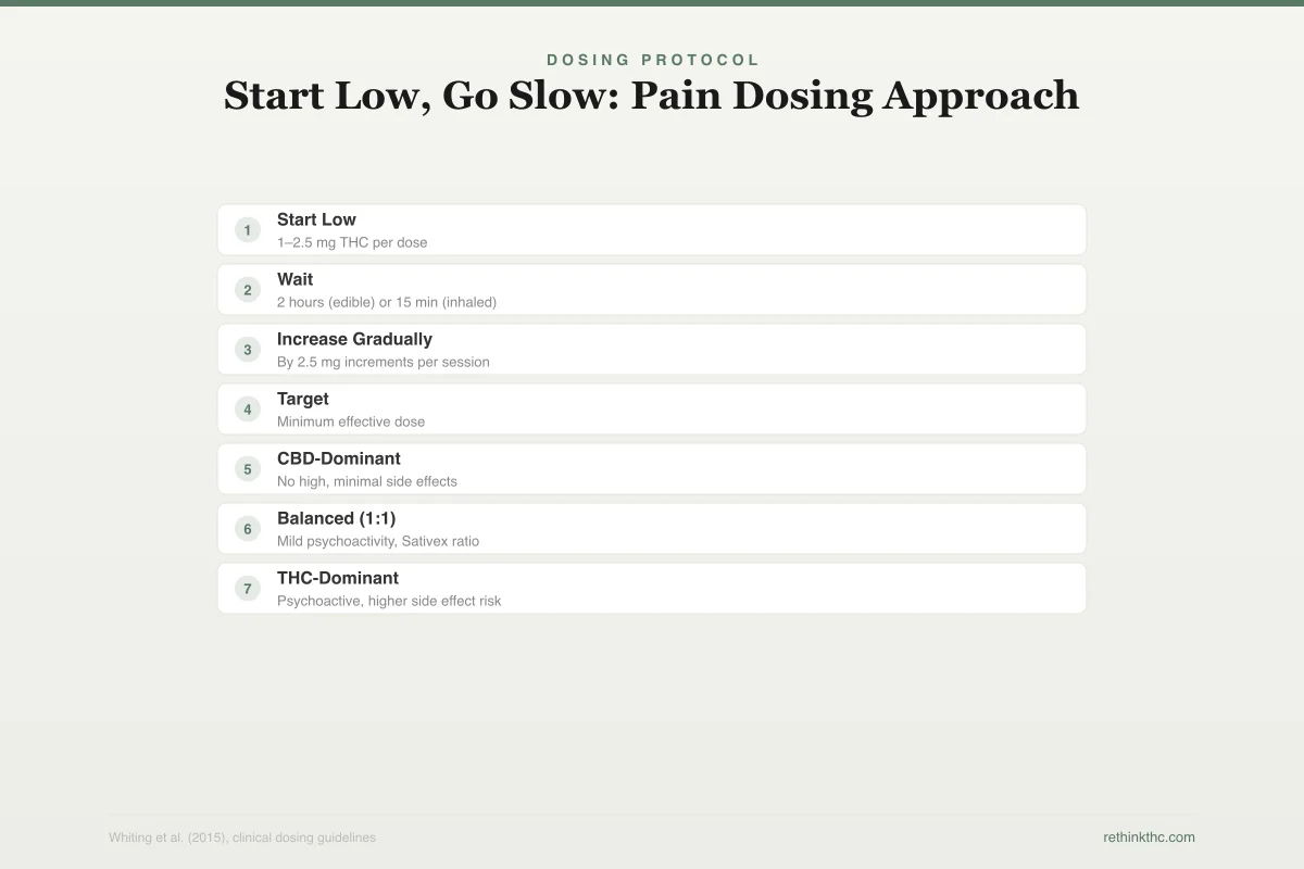 1–2.5 mg THC per doseBegin at the lowest available dose to assess tolerance