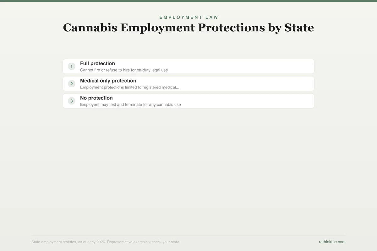 - Employment protections for cannabis users vary wildly by state — some states ban firing workers for legal off-duty use while most still allow drug testing and termination