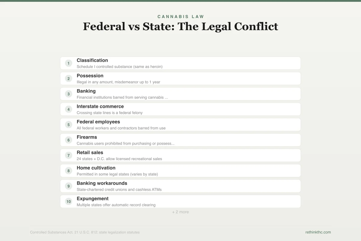 - Cannabis is still a Schedule I controlled substance under federal law — putting it in direct conflict with the 24 states plus D.C. that have legalized recreational use as of early 2026