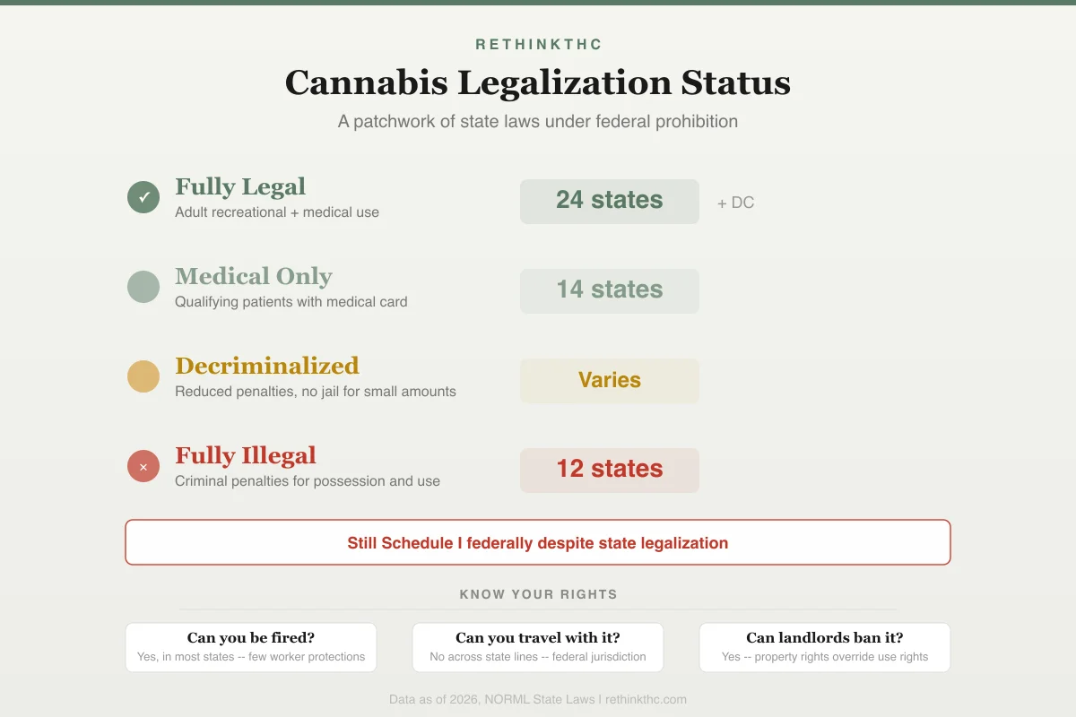 As of early 2026, 24 states plus the District of Columbia have legalized recreational cannabis for adults 21 and older. An additional 14 states have comprehensive medical cannabis programs. The remaining states have either limited CBD-only programs or no legal cannabis access at all.