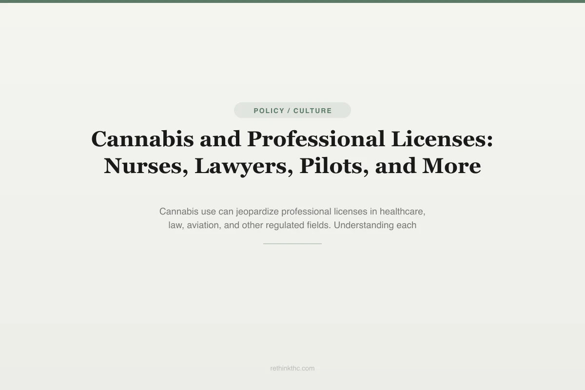 The practical framework for evaluating cannabis-related risk to your professional license involves answering several questions. Is your profession regulated by a federal agency with drug testing requirements? If yes, cannabis use is incompatible with your license regardless of state law. Is your licensing board in a state where cannabis is legal? If yes, the risk is lower but not zero. Does your board have specific guidance on cannabis use? Check your board's website or call and ask. Does your employer drug test independently of your licensing board? Your job and your license are separate risks that may need to be evaluated independently.