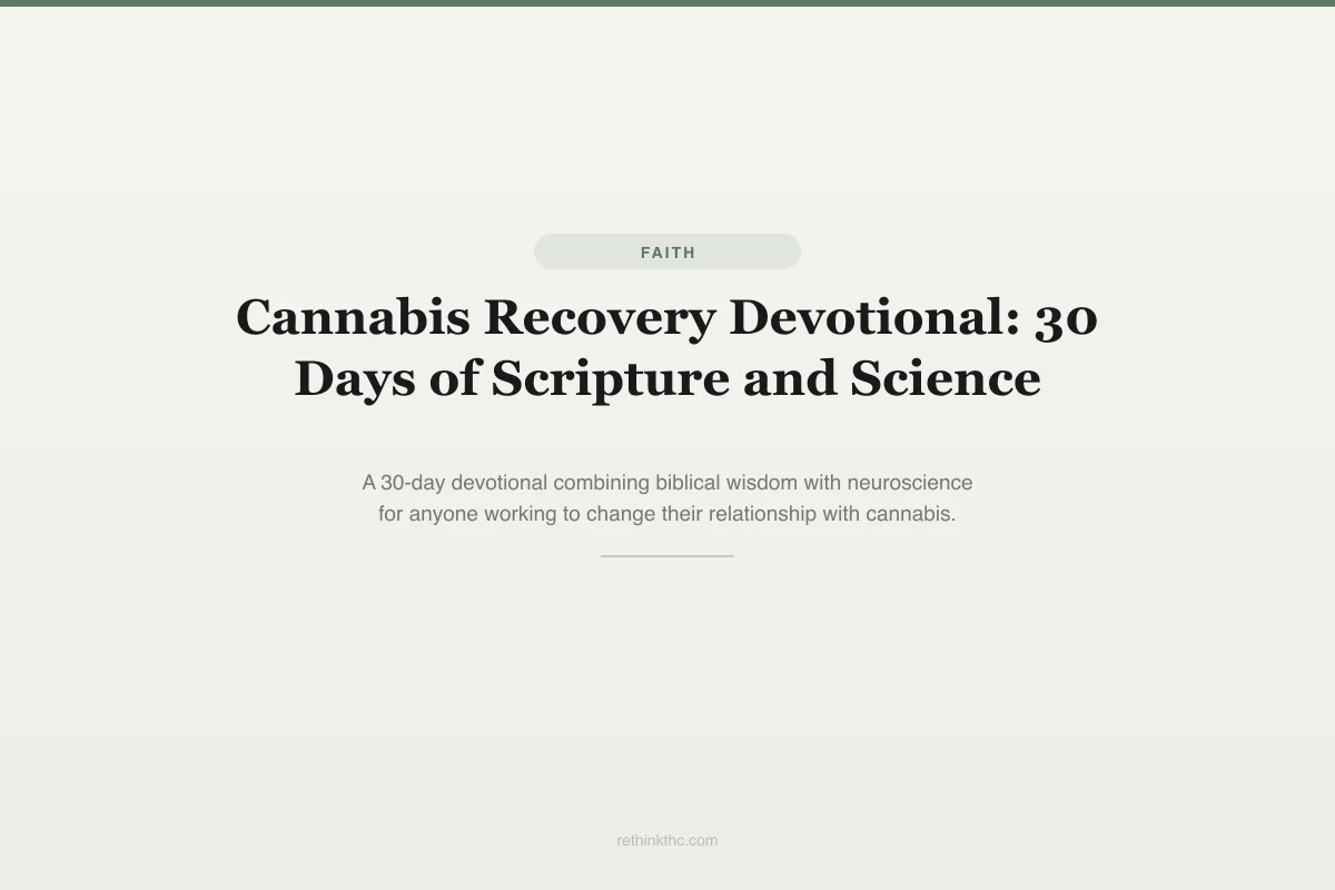 30-day devotional for Christians reassessing cannabis use, pairing scripture with neuroscience along the tolerance break timeline. Structure: Week 1 (Days 1-7) = acute withdrawal period — 2 Corinthians 5:17 (new creation/CB1 recovery begins within hours), James 1:2-3 (withdrawal peaks days 2-4 = growing pains of restoration), Psalm 4:8 (insomnia/REM rebound = sleep architecture restoring), Isaiah 40:31, Psalm 34:18, 2 Corinthians 12:9, Jeremiah 29:11. Week 2 (Days 8-14) = clarity emerging — John 8:32 (cognitive function measurably improving by end of week 1), Psalm 139:23, Psalm 23, 1 Peter 5:7, Psalm 46:10, Psalm 147:3, Joshua 1:9; emotional emergence as REM-mediated emotional processing resumes after months of suppression. Week 3 (Days 15-21) = building foundations — Ephesians 2:10 (dopamine signaling normalizing, natural rewards becoming satisfying again), Colossians 3:23, Ecclesiastes 4:9, Galatians 5:22-23, Proverbs 16:3, Philippians 4:13, 1 Thessalonians 5:11; establishing new patterns (exercise, community, creativity, service). Week 4 (Days 22-30) = stepping into freedom — Isaiah 43:18-19 (CB1 ~80% recovered at 3 weeks), 1 Corinthians 10:13, Proverbs 24:16, Psalm 51:10, Philippians 2:13, Hebrews 12:1-2, Proverbs 3:5, Romans 8:28, Philippians 1:6; consolidation, ongoing intentionality. Central themes: grace over shame, transformation as process not event, setbacks expected, faith and neuroscience complementary.