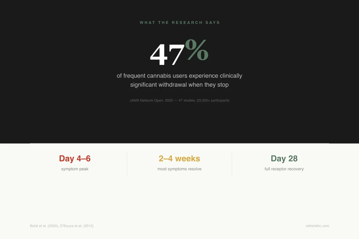 A 2020 meta-analysis published in JAMA Network Open analyzed data across 23 studies involving over 27,000 participants and found that 47% of frequent cannabis users experience clinically significant withdrawal symptoms when they stop.[1] That is nearly one in two people. If you are one of them, you are not weak and you are not imagining things. Your brain physically adapted to regular THC, and now it is readjusting.