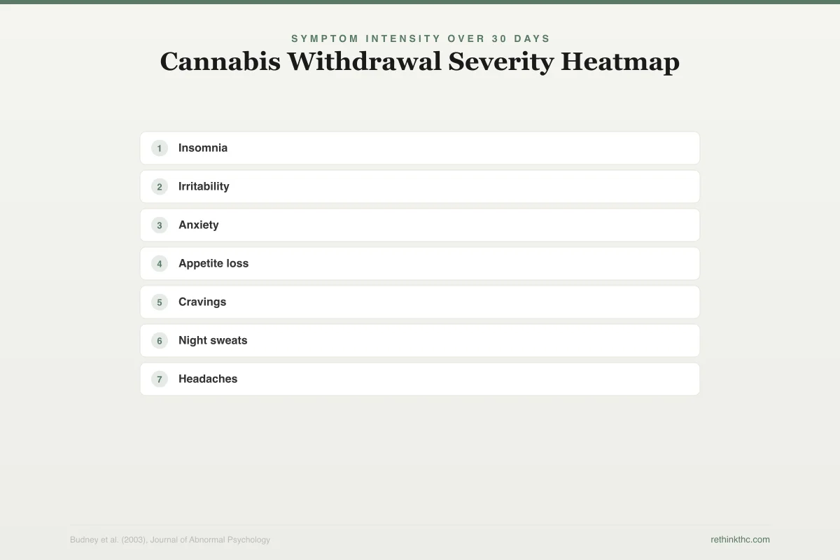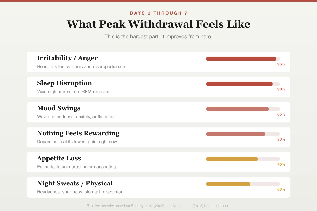 | Irritability / anger | ~70% of cases | 1–2 weeks | Emotional thermostat recalibrating without THC's amygdala dampening |
