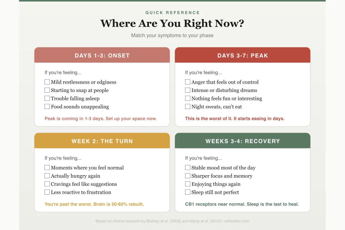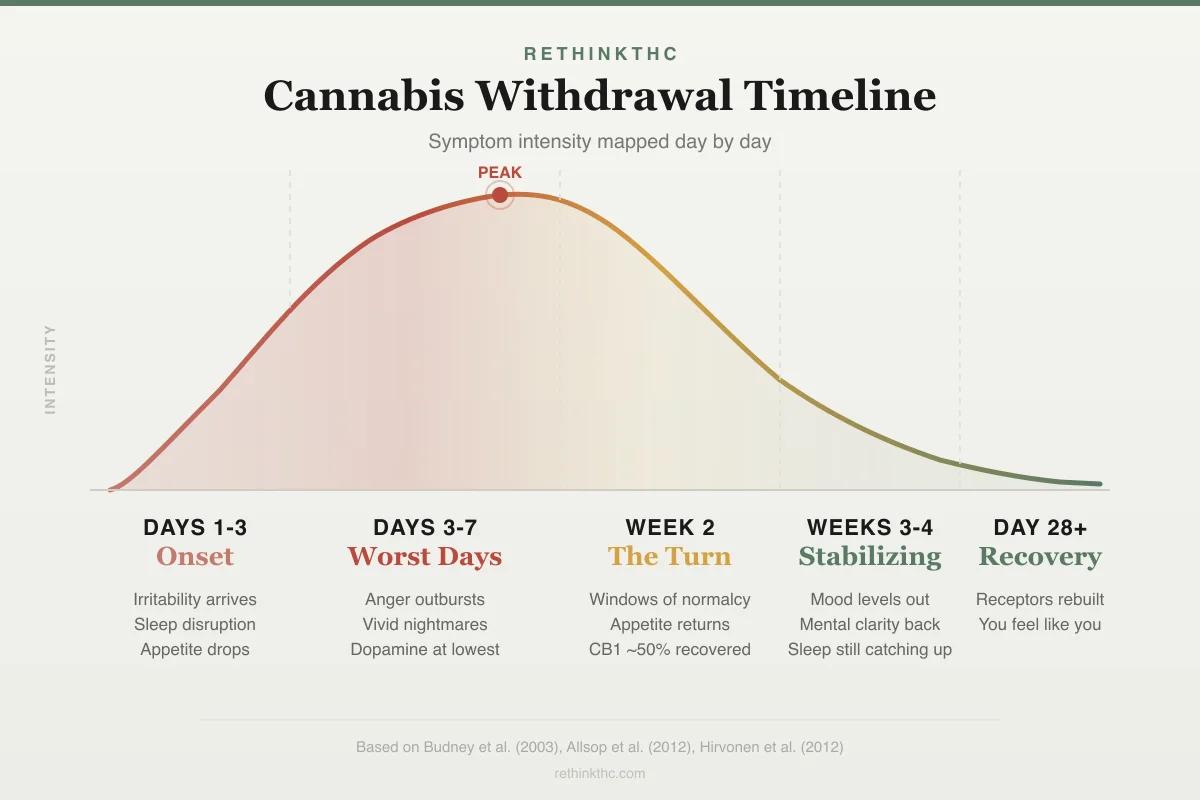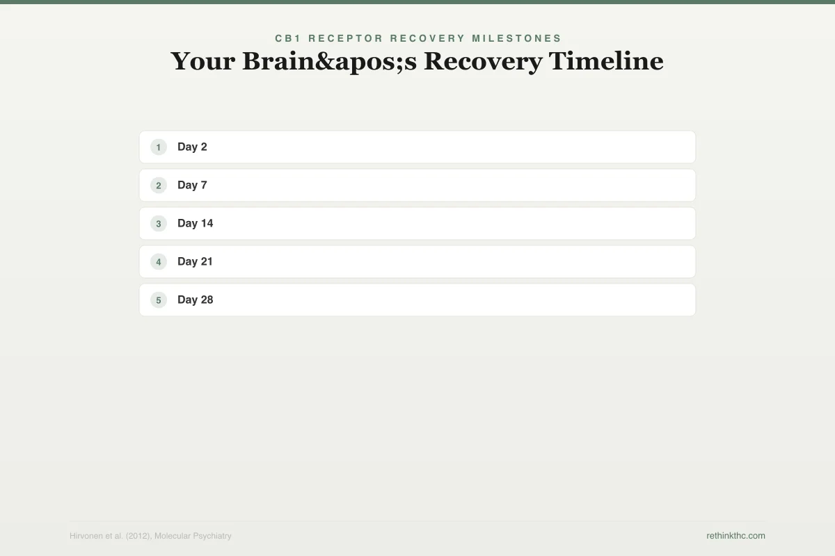 A 2012 study in Molecular Psychiatry used PET brain imaging to confirm that CB1 receptor levels start recovering within just two days of quitting and return to normal levels by about day 28.[2] That is the biological basis for why withdrawal follows a predictable timeline. Your brain is literally rebuilding the hardware that THC wore down.