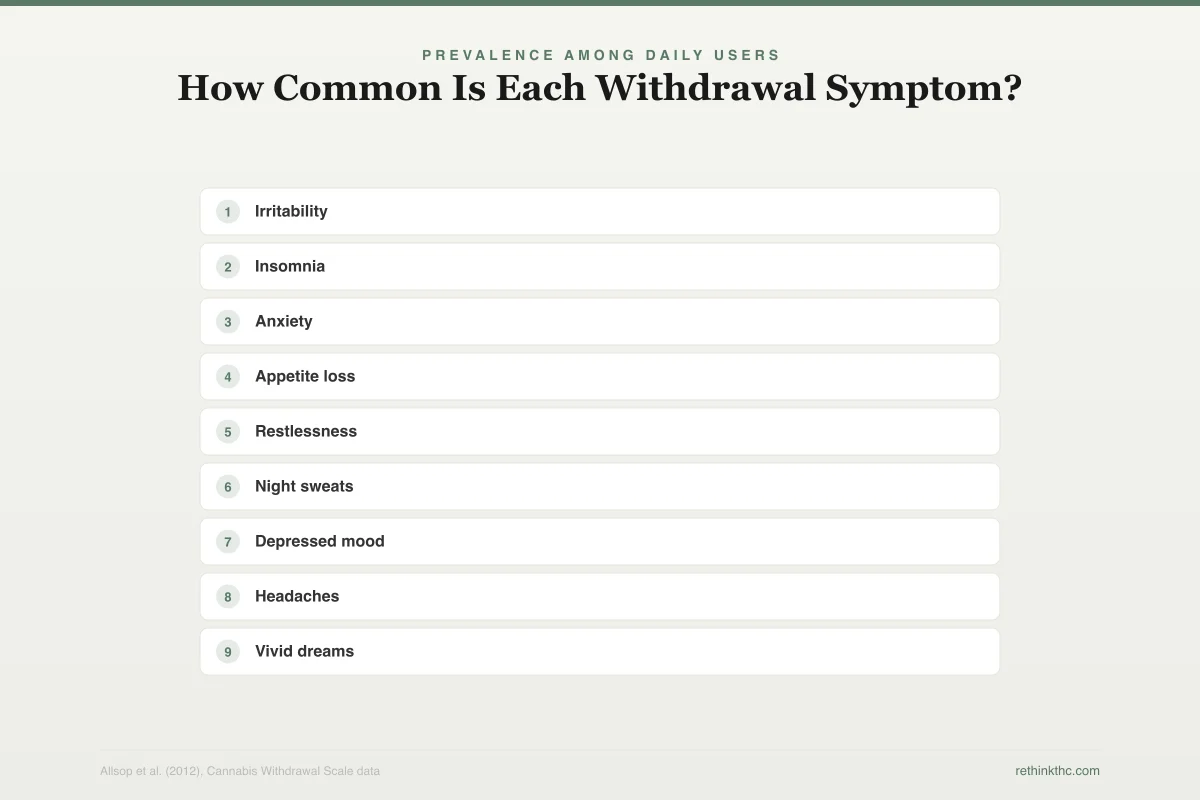 Most people notice something within the first 24 hours. You might feel restless, irritable, or just "off." Sleep is usually the first thing to go. A 2004 review by Budney and colleagues confirmed that withdrawal onset typically occurs within 24 to 72 hours of cessation, with most users reporting symptoms by the end of the first day.[4][16] We cover every detail of that first week in a separate guide.