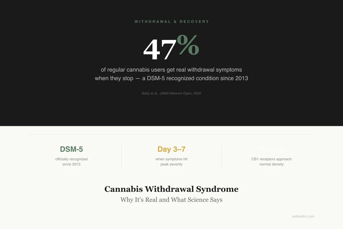 About 47% of regular cannabis users get real withdrawal symptoms when they stop — a DSM-5 recognized condition since 2013.