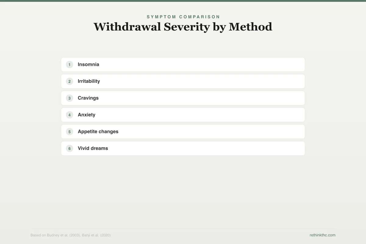 The intensity of cold turkey withdrawal depends heavily on your usage level. Someone who smoked a few times a week may experience mild irritability and a couple of rough nights. Someone who used high-potency products multiple times daily may face significant insomnia, anxiety, and appetite loss for one to two weeks.