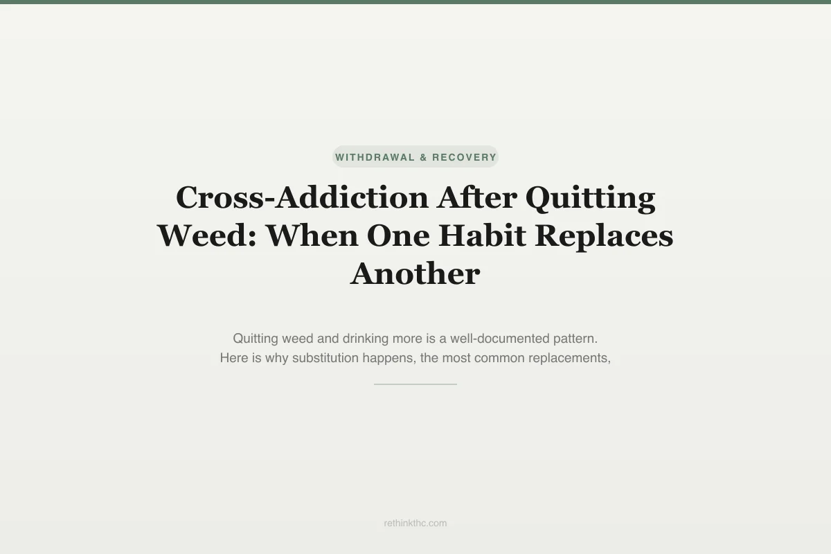 Cross-addiction after quitting cannabis is a documented pattern where the brain's demand for reward and the person's need for a coping tool redirect toward a new substance or behavior. The substitution happens because quitting leaves two simultaneous gaps: the neurochemical gap (reduced dopamine signaling from reward system downregulation) and the functional gap (losing the coping tool cannabis was providing for stress, anxiety, boredom, or sleep). Alcohol is the most common replacement, followed by nicotine, food, and compulsive screen use. Alcohol is particularly concerning because its dependence rate is higher (15% vs 9% for cannabis) and its withdrawal can be medically dangerous. The key distinction between healthy replacement and cross-addiction is whether the new behavior creates its own dependence and harm. Exercise is the most evidence-supported neurochemical substitute because it increases anandamide through the same CB1 receptor pathways. The most effective protection is identifying what cannabis was specifically doing for you and building deliberate alternatives before the gap creates pressure.