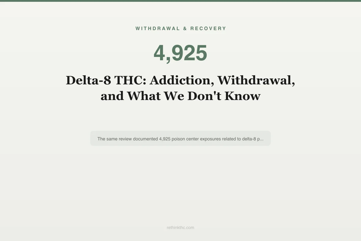 These are not theoretical risks. The same review documented 4,925 delta-8-related exposures reported to U.S. poison control centers in 2021 and 2022, representing a 79.2% increase year over year.[1] Many of these cases involved unintentional exposures, including children, and some required hospitalization.