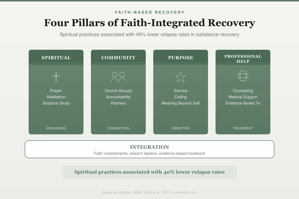 Faith-based marijuana recovery addresses dimensions that purely clinical programs sometimes miss: purpose, identity, community belonging, and the deep question of why change matters. Traditional 12-step programs like Marijuana Anonymous fall short for some believers because the "powerlessness" framing conflicts with faith traditions emphasizing God-given agency, the meeting culture can feel misaligned, and the generic "Higher Power" language dilutes the specificity of a personal relationship with God. Alternatives include Celebrate Recovery (operating in 35,000+ churches across 29 countries), church-based support groups, and pastoral counseling. Neuroimaging research by Newberg at Thomas Jefferson University shows prayer and contemplative meditation activate prefrontal cortex regions and reduce amygdala activity, directly counteracting craving and anxiety circuits. Moos and Moos's 2006 Addiction study found community involvement among the strongest predictors of sustained abstinence. Kaskutas's 2009 research showed that developing a new recovery identity significantly improved long-term outcomes, and faith traditions are built on exactly this kind of identity transformation.