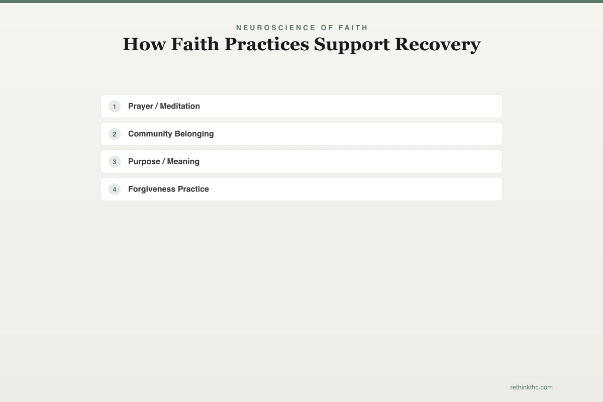 - Faith based marijuana recovery is a real, research-supported approach — spiritual practice activates measurable brain and psychological mechanisms tied to addiction and behavior change