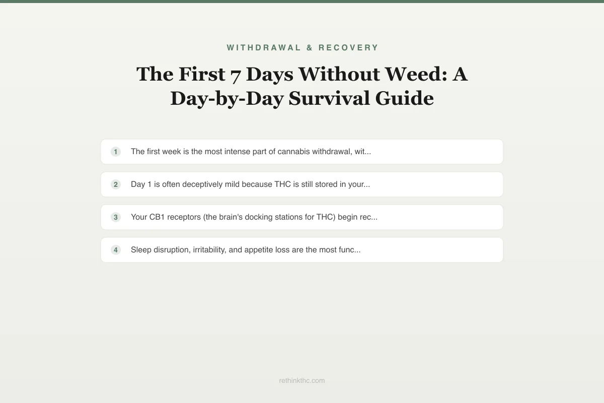 This article is designed to be your companion through those seven days. Bookmark it. Come back each morning. Each day includes what to expect physically, what to expect mentally, and one practical action to take. If you want the broader view of what happens across the full withdrawal arc, the weed withdrawal timeline covers weeks 1 through 6. This guide zooms in on the days that matter most.