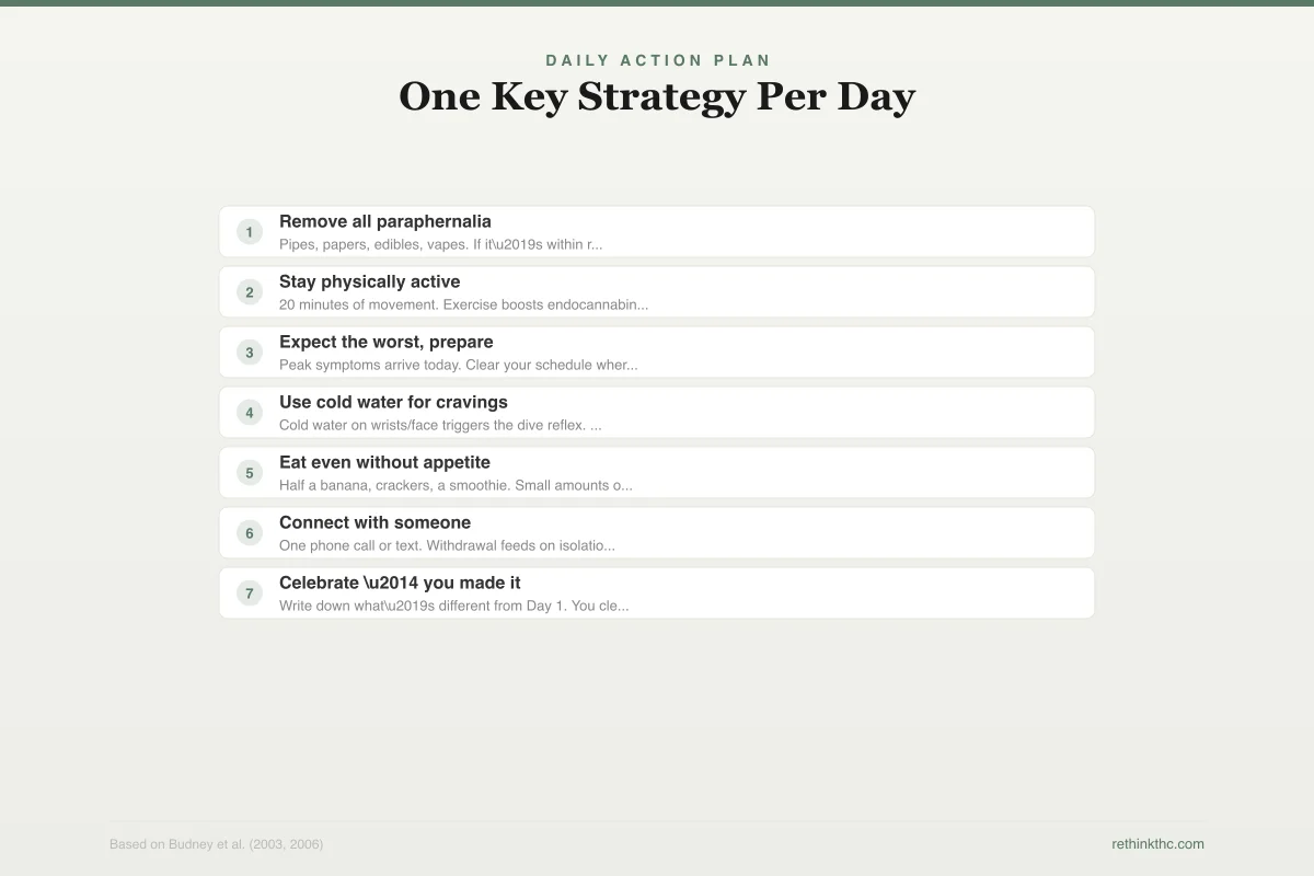 Compare today to day 1. Write down what is different. What is better, even marginally. What surprised you. What was harder than expected. This record serves two purposes: it gives you evidence of progress that you can reference if week 2 has a hard day, and it helps you understand your own patterns. Knowing your personal withdrawal profile makes future decisions about cannabis clearer and more informed.