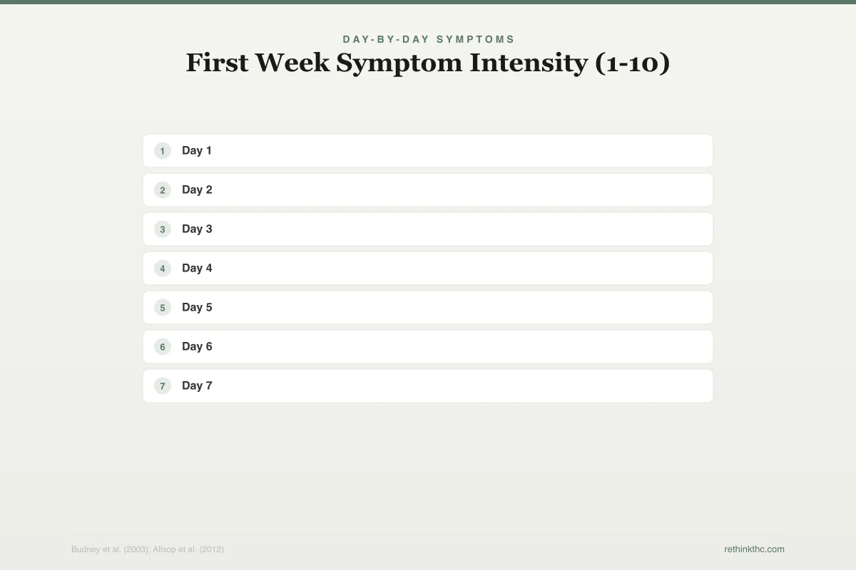 - The first week is the most intense part of cannabis withdrawal — clinical research shows symptoms peak between days 2 and 6