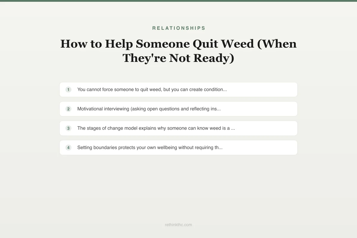 Helping someone quit cannabis requires understanding that direct confrontation triggers psychological reactance — a defensive response where the person doubles down on the targeted behavior. A 2004 study in the Journal of Consulting and Clinical Psychology found confrontational approaches produced worse outcomes than supportive approaches across substance use contexts. The stages of change model (Prochaska and DiClemente) explains why someone can acknowledge a problem without acting: precontemplation, contemplation, preparation, action, and maintenance are sequential stages most people cycle through multiple times before lasting change. Motivational interviewing (MI), developed by Miller and Rollnick, is the most evidence-supported communication approach — a 2015 meta-analysis in Addiction confirmed MI significantly increased likelihood of reducing cannabis use. Core MI principles applicable without clinical training: ask open questions instead of making statements, reflect without judgment, resist the urge to fix, and affirm autonomy. The enabling vs. supporting distinction is critical: enabling removes natural consequences while supporting maintains care without shielding from reality. Boundaries protect the helper's wellbeing and differ from threats by centering the helper's needs rather than the user's behavior.