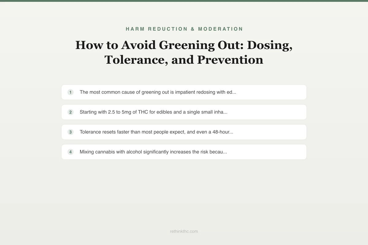 Most greening-out incidents follow predictable patterns, especially impatient edible redosing and mixing with alcohol, and starting at 2.5 to 5 milligrams with a two-hour wait prevents most overconsumption.