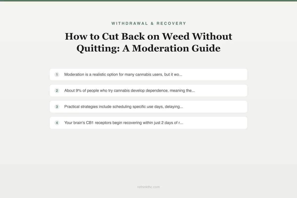 Moderation is a realistic option for many cannabis users. About 9% of people who try cannabis develop dependence, meaning the majority can successfully adjust their patterns. Brain imaging shows CB1 receptors begin recovering within just 2 days of reduced use, so even small cutbacks produce measurable neurological changes. Practical strategies include scheduling specific use days, delaying first use until evening, switching to lower-potency products, tracking consumption, and taking periodic tolerance breaks. Moderation works best for people without Cannabis Use Disorder. If you consistently break your own rules, experience significant withdrawal from merely cutting back, or find sober days unbearable, these patterns suggest your relationship with cannabis may need a different approach than simple reduction.