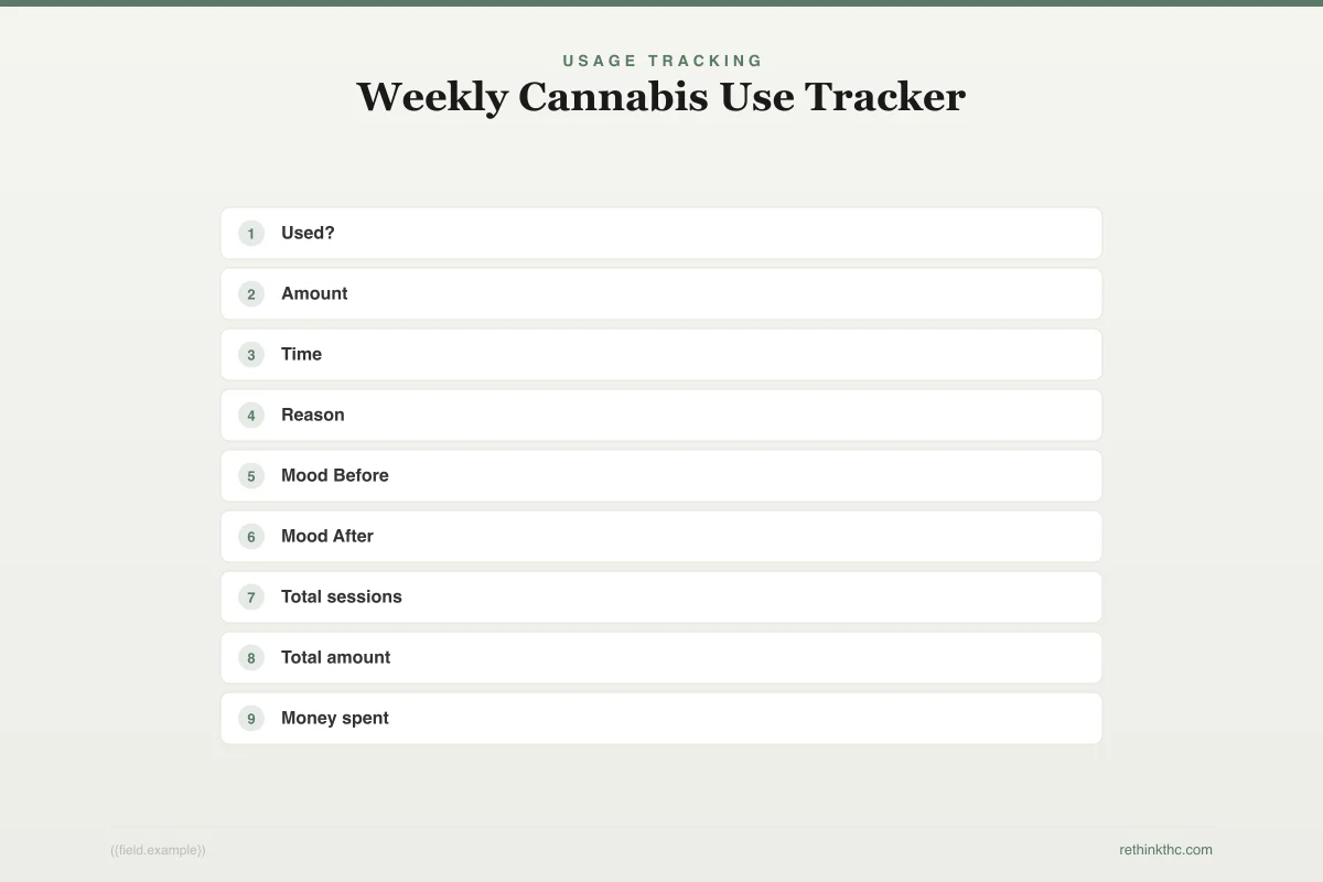Most people underestimate how much they use. Start a simple log: date, time, amount, and how you felt afterward. You can use a notes app, a spreadsheet, or a dedicated cannabis tracking app. After two weeks of tracking, you will have an honest baseline. From there, set a specific reduction target (for example, 25% fewer sessions per week or half the amount per session) and track against it.