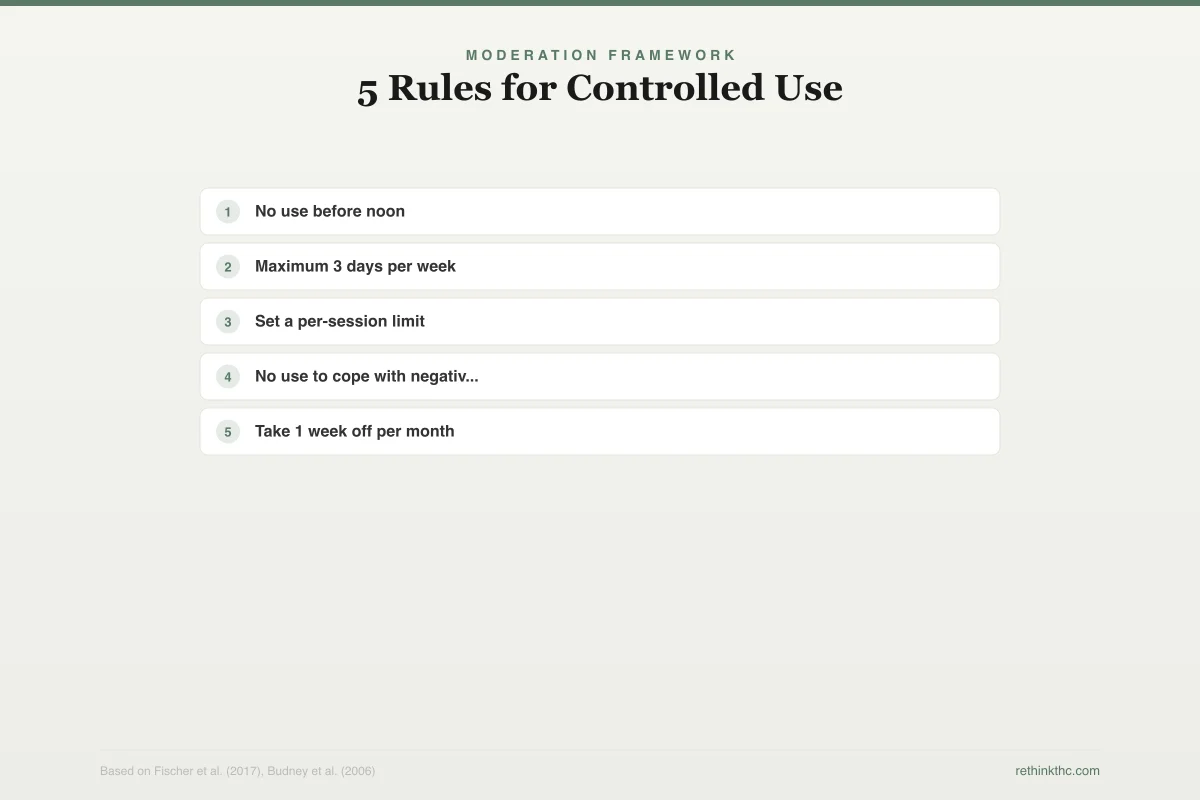 - Practical strategies include scheduling specific use days, waiting until evening for your first use, switching to lower-potency products, and tracking what you consume