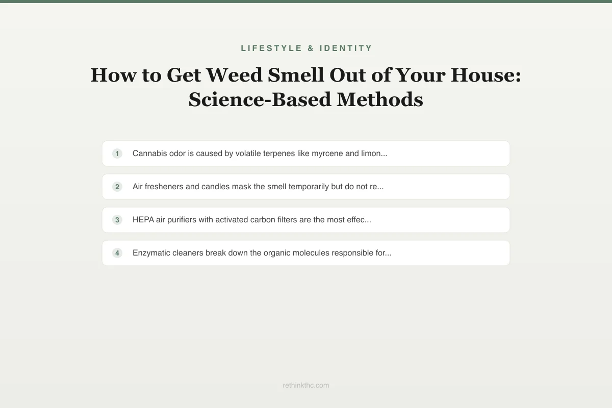 Science-based guide to removing cannabis odor from homes covering chemistry, why smell lingers, ineffective methods, effective airborne solutions, surface-absorbed solutions, HVAC considerations, and prevention. Chemistry: terpenes (myrcene, limonene, pinene, linalool) + combustion byproducts (PAHs, particulate, VOCs); lipophilic = bind to organic materials not water; absorb into fabric fibers, paint, wood, carpet. Why lingers: soft surfaces as reservoirs (off-gas slowly); HVAC recirculates contaminated air; walls/ceilings accumulate tar/terpene residue; enclosed spaces concentrate compounds. Ineffective: air fresheners/candles (mask only), incense (adds more combustion residue), brief window opening (no surface effect). Effective airborne: HEPA + activated carbon purifier (particles + VOCs); sustained cross-ventilation with box fan negative pressure; ozone generators (powerful oxidizer, space must be unoccupied). Effective surface: enzymatic cleaners on fabrics (break down organic molecules); vinegar solution on hard surfaces (cuts oily terpene residue); TSP for heavily contaminated walls; steam cleaning carpets/upholstery (reaches deep padding); hot wash + enzyme detergent + vinegar rinse for washables. HVAC: replace filter with MERV 13+; professional duct cleaning ($300-500); clean/replace window AC filters. Prevention: dry herb vaporizer (no combustion byproducts); dedicated ventilated room with carbon purifier; smoke buddy/sploof; sealed room (draft stoppers, closed vents); edibles/tinctures = no airborne odor.