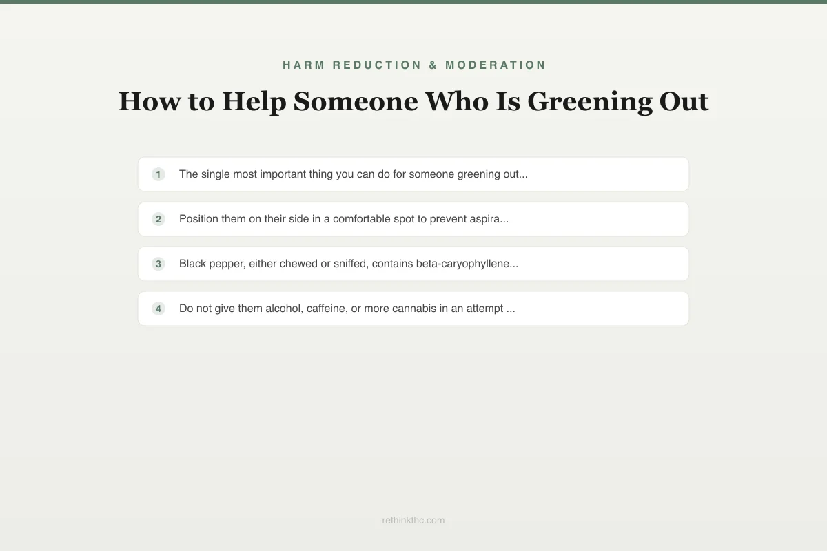 Step-by-step guide to helping someone greening out covering assessment, safe positioning, verbal reassurance, hydration, black pepper remedy, nausea management, breathing regulation, what not to do, emergency criteria, and aftermath care. Assessment: confirm cannabis-only (lower threshold for EMS if other substances involved); gauge severity (conscious/communicating = typical green-out, unresponsive/seizure/chest pain = call 911); check environment safety. Step 1 — safe space: quiet location away from stimulation; lying on side (recovery position prevents aspiration); let them choose comfortable position. Step 2 — reassurance: most impactful intervention; steady voice, specific factual statements ("this is temporary, ~30 minutes to improve"); acknowledge suffering without minimizing ("you're fine" feels invalidating); reality-test paranoid thoughts with physiological explanations. Step 3 — hydration: small slow sips of room-temperature water; avoid carbonated/caffeinated/alcoholic beverages. Step 4 — black pepper: beta-caryophyllene (CB2-binding terpene) may modulate THC anxiety; chew 2-3 peppercorns or sniff; Russo et al. mechanism; lemon/limonene similar; risk-free intervention. Step 5 — nausea: do not suppress vomiting (provides relief); cool damp cloth on forehead/neck; bland cracker after vomiting if tolerated. Step 6 — breathing: guide 4-count inhale, 6-count exhale (longer exhale activates parasympathetic); breathe with them; 5-10 cycles. What NOT to do: no more cannabis, no alcohol, no caffeine, no cold shower (triggers sympathetic response), do not leave alone, do not mock/record. Emergency: unresponsive, seizure, severe chest pain, unknown substances, pre-existing cardiac conditions. Aftermath: normalize experience, offer food/rest, discuss prevention without lecturing, respect their future choices.
