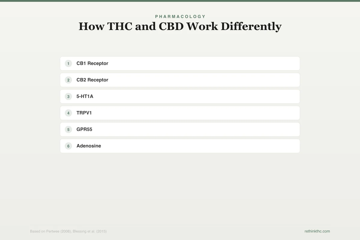 THC produces its effects by directly activating CB1 receptors -- CBD works through multiple indirect pathways, which is why it lacks psychoactive effects but has broader therapeutic potential