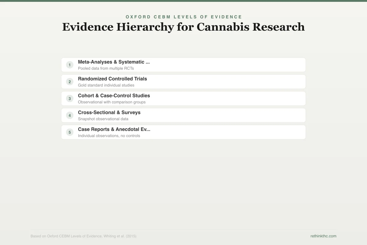 The visual below shows how different types of evidence rank — and why most medical cannabis claims sit in the lower tiers.