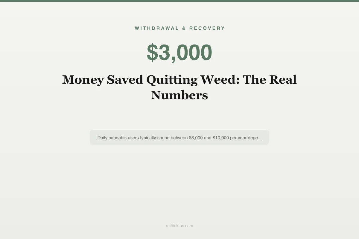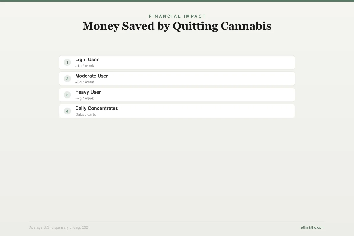 The most effective use of the financial data point is as part of a larger picture: this is one of the real costs of this behavior, alongside the effects on motivation, sleep, cognition, and relationships. For a complete view of what changes when you stop, see benefits of quitting weed. If you want a more detailed breakdown of the total cost of cannabis use including hidden expenses most people overlook, the cannabis cost calculator and the how much are you really spending calculator both approach the question from different angles.
