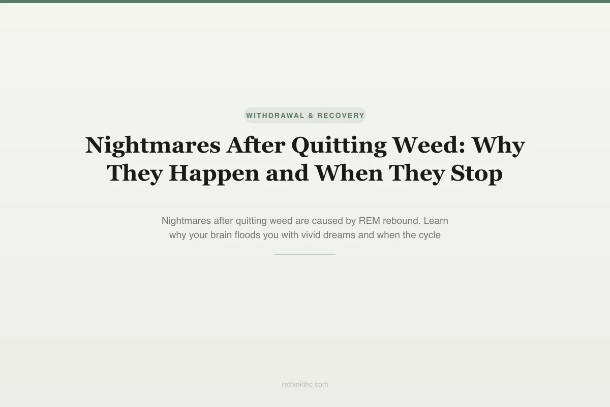 Nightmares after quitting weed are caused by REM rebound, a well-documented neurological process where your brain compensates for the REM sleep that THC suppressed during use. Babson's 2017 review confirmed THC suppresses REM sleep in regular users. When you quit, your brain overcorrects with extended, intensified REM periods, producing dreams that are longer, more vivid, and more emotionally charged. Vivid dreams typically begin nights 2 to 3, peak during weeks 1 to 3, and settle by day 45. The disturbing content reflects an emotional processing backlog from months or years of suppressed REM, not a sign of psychological dysfunction. Effective coping strategies include rigid sleep schedules, pre-bed journaling, and reframing nightmares as evidence of active brain healing. Imagery rehearsal therapy can help with persistent cases.