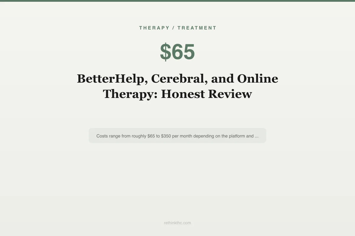 Online therapy platforms remove the primary barriers to professional support during cannabis withdrawal: leaving the house, waiting weeks for appointments, and navigating intake processes while cognitively impaired. A 2020 meta-analysis in the Journal of Anxiety Disorders found internet-delivered CBT produced outcomes comparable to face-to-face therapy for anxiety disorders. A 2018 Journal of Medical Internet Research study confirmed teletherapy significantly increased treatment engagement with lower dropout rates. Three platforms compared: BetterHelp (largest network of 30,000+ therapists, $260-400/month, no direct insurance, best for therapist selection flexibility), Cerebral (integrated therapy + medication management, $85-350/month, accepts some insurance, best for co-occurring anxiety/depression needing pharmacological support), Talkspace (messaging-first model, $260-436/month, broadest insurance acceptance, best for asynchronous processing between sessions). Key limitation: platform therapists are generalists by default — active screening is required. Screening strategy: specify cannabis cessation during intake, ask first-session questions about cannabis withdrawal experience and CBT methodology, look for CBT specialization (2019 Clinical Psychology Review: CBT-based interventions significantly reduced cannabis use and co-occurring anxiety). Not appropriate for crisis situations, severe PTSD/bipolar/psychotic symptoms, or when therapeutic relationship requires physical presence. Cost alternatives: BetterHelp financial aid, Open Path Collective ($30-80/session), community mental health centers, SAMHSA helpline referrals.