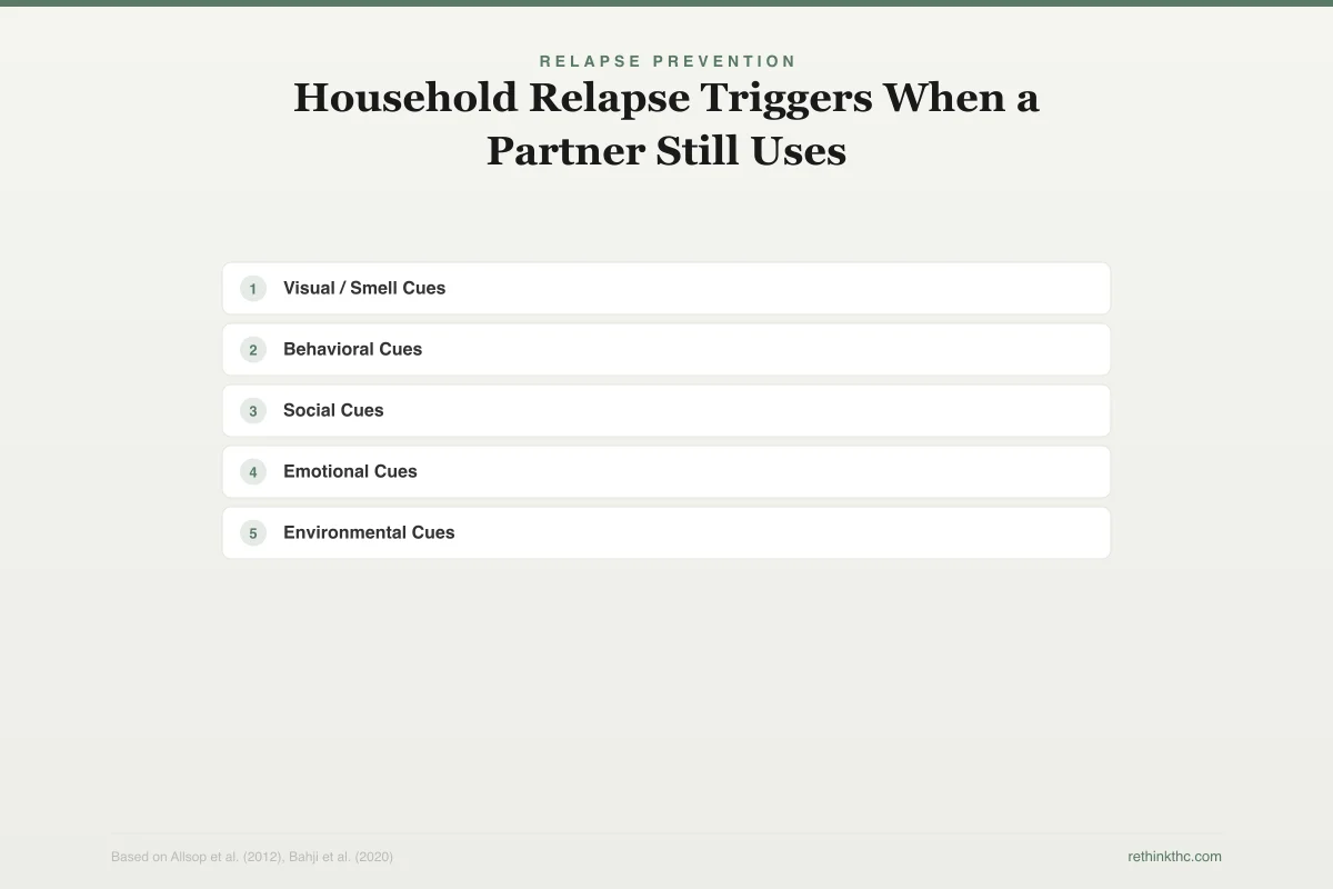 Living with a partner who still uses cannabis while you are in recovery is one of the most common and least discussed challenges of quitting. Environmental exposure to cannabis (smell, paraphernalia, routine proximity) is a documented relapse trigger. Research shows withdrawal severity directly predicts relapse risk, and household cannabis presence raises the baseline difficulty of staying quit. Ultimatums and attempts to control a partner's use almost always create resentment. Effective strategies include having direct conversations that name the problem without blame, setting boundaries around your own environment rather than their behavior, building recovery infrastructure outside the relationship, and creating new shared rituals. If your partner refuses any accommodations or actively undermines your recovery, professional support or honest reassessment of the relationship may be necessary.