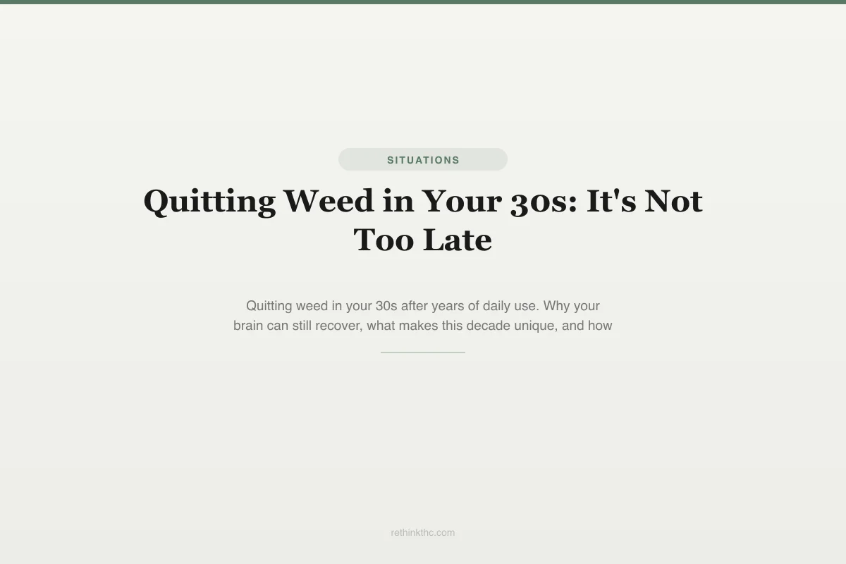 Quitting weed in your 30s is biologically favorable despite longer use histories. Key advantage: prefrontal cortex fully matures ~age 25, providing full impulse control and planning capacity (2014 Frontiers in Psychiatry โ cannabis users quitting after 25 showed better executive function recovery). Decade-plus daily use creates deeper CB1 receptor downregulation, but Hirvonen 2012 (Molecular Psychiatry) PET imaging showed receptor density returns to normal by ~day 28 regardless of use duration. Cognitive deficits resolve after sustained abstinence per Scott 2018 meta-analysis (JAMA Psychiatry). The 30s life stage provides both motivation (career, relationships, parenthood, finances) and structural accountability that younger quitters lack. Primary challenge is identity disruption: no adult reference point for life without cannabis after 10-15 years of daily use. Lally 2010 (European Journal of Social Psychology) found new habits take average 66 days to become automatic. Practical strategies: leverage existing life structure as anchors, plan 4-8 week adjustment window (sleep disruption may persist 3-6 weeks), exercise to stimulate endocannabinoid system (2019 British Journal of Sports Medicine โ anxiolytic effects comparable to some medications), address coping skills gap, tell at least one person. Professional help warranted for: severe symptoms interfering with work/family, repeated failed quit attempts, cannabis entangled with unmanageable anxiety/depression.