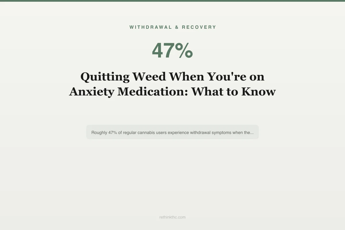 View as imageYou take anxiety medication. You also use cannabis. Now you want to quit the cannabis, and the questions are stacking up. The concerns are real: whether withdrawal will be worse because of the medication, whether the medication will stop working, whether you should quit both at the same time, whether your doctor will judge you for using weed while on SSRIs.