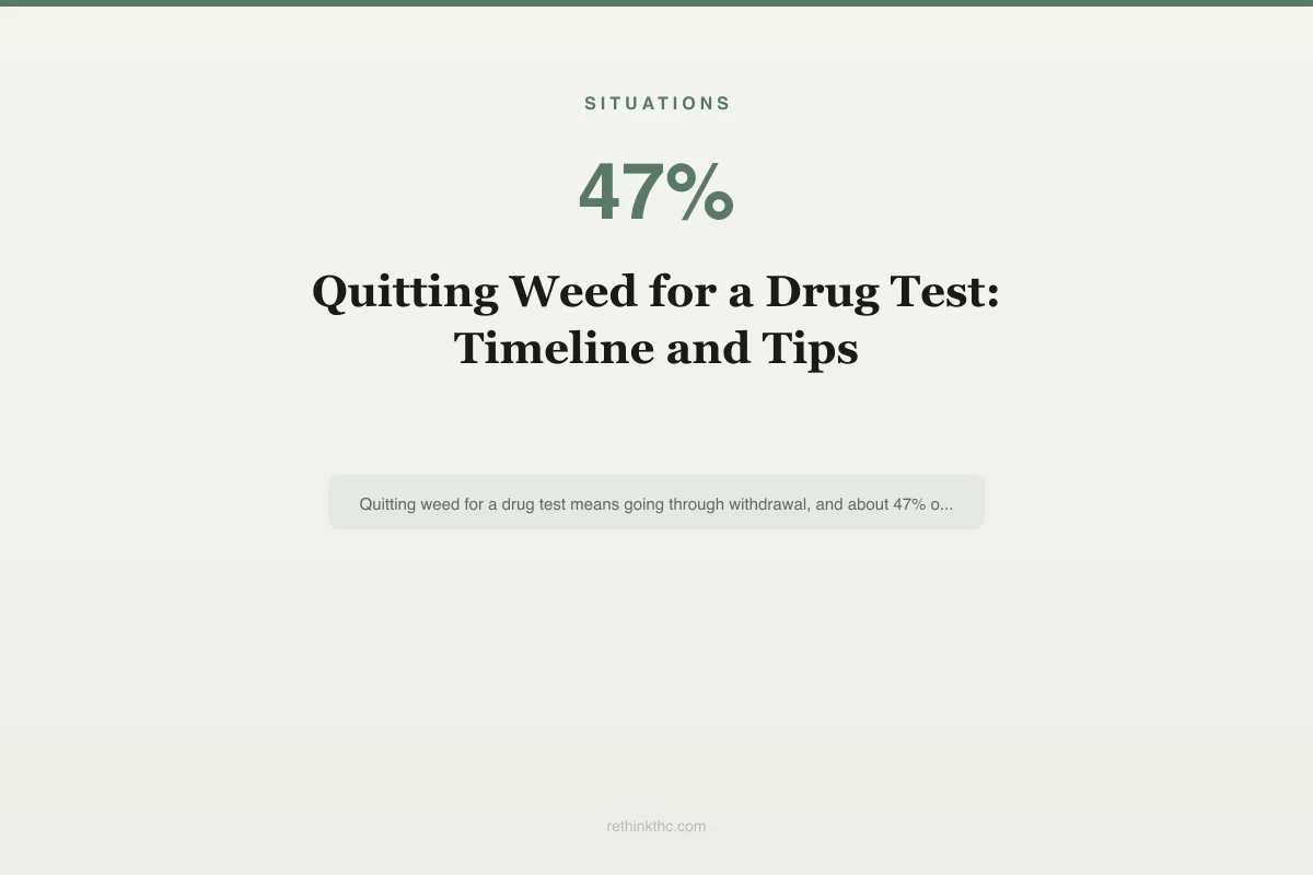 View as imageYou have a drug test coming up, and you are still using cannabis. Maybe you found out yesterday. Maybe you have a few weeks. Either way, the math is now personal: how long do you need, and can you make it in time? Quitting weed for a drug test is one of the most common reasons people stop using cannabis, and it comes with a unique kind of pressure. You are not choosing to quit on your own terms. You are racing a deadline. That changes everything about the experience, from the planning to the withdrawal to the mental game of waiting.