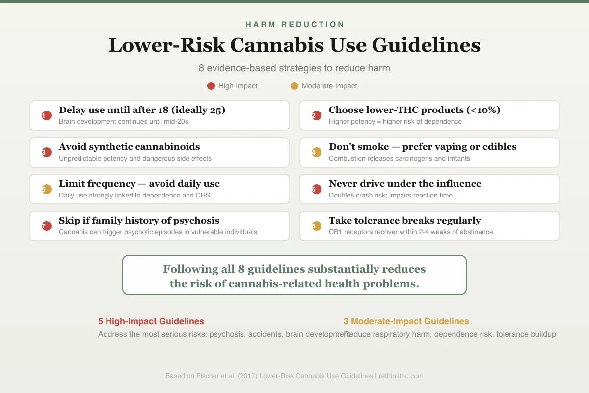 That is exactly what exists. In 2017, a team led by Benedikt Fischer published the Lower-Risk Cannabis Use Guidelines (LRCUG) in the American Journal of Public Health, synthesizing the available evidence into 10 actionable recommendations for reducing cannabis-related health risks. These are specific, evidence-based recommendations designed not to eliminate cannabis use but to reduce the harms most strongly supported by scientific evidence. Think of them as harm reduction for cannabis, the same approach that public health has long applied to alcohol, sex, and driving.
