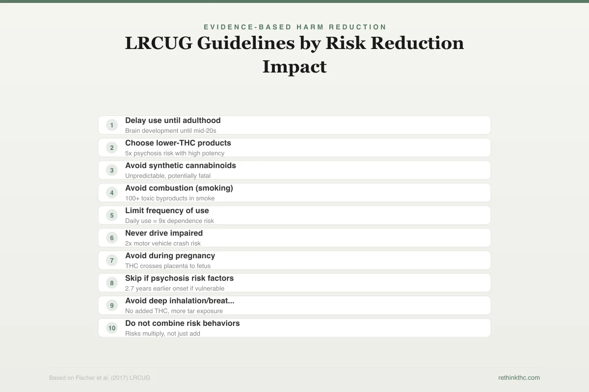 The LRCUG have been endorsed or adapted by public health agencies in Canada, where they were originally developed, and have influenced cannabis policy frameworks in multiple countries. They represent the scientific consensus on what the modifiable risk factors actually are.