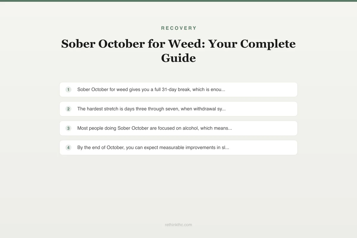 View as imageSober October started as a challenge centered on alcohol. But a growing number of people are using it as a framework for stepping away from weed, and the timing actually works in their favor. Thirty-one days of Sober October for weed lines up almost perfectly with the neuroscience of cannabinoid receptor recovery, making it one of the most effective structured breaks you can take. This guide covers what to expect each week, how to handle the parts that are genuinely hard, and what has actually changed in your brain by November 1.