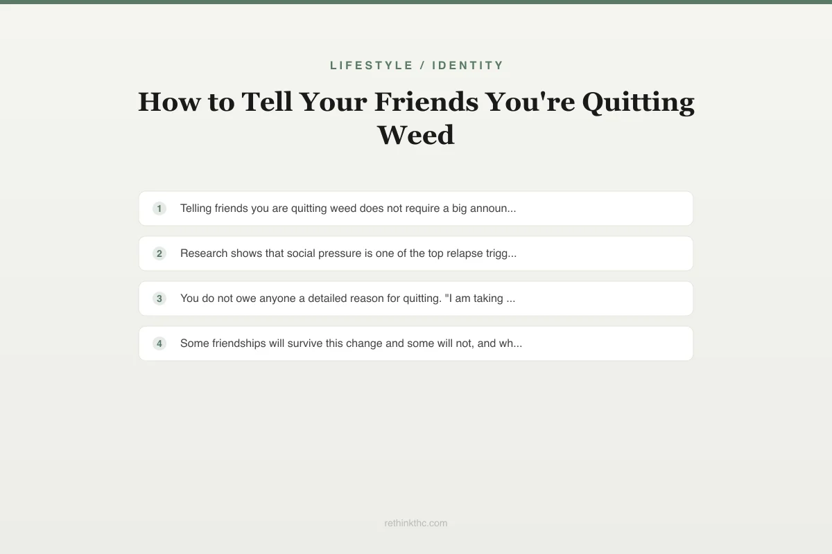 View as imageYou have made the decision to quit. Maybe you followed a structured guide to quitting weed, maybe you woke up one morning and just knew. Either way, now comes the part nobody prepares you for: telling friends you are quitting weed. Not the withdrawal symptoms, not the cravings. The actual social moment of saying the words out loud to people who are used to smoking with you. You might be worried about judgment, pushback, or losing friendships entirely. Those worries are not irrational. How this conversation goes depends on who you are talking to, what you say, and when you say it.