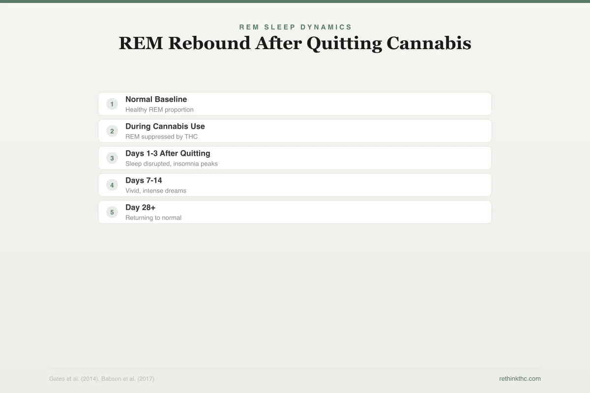 REM rebound is a well-documented neurological process that occurs when you stop using cannabis after regular use. THC suppresses REM sleep — the dreaming stage — and when it is removed, your brain overcorrects with extended, intensified dream periods. Vivid dreams typically peak in weeks 1 to 3 and resolve within 45 days. It is a sign of recovery, not a sign that something is wrong.
