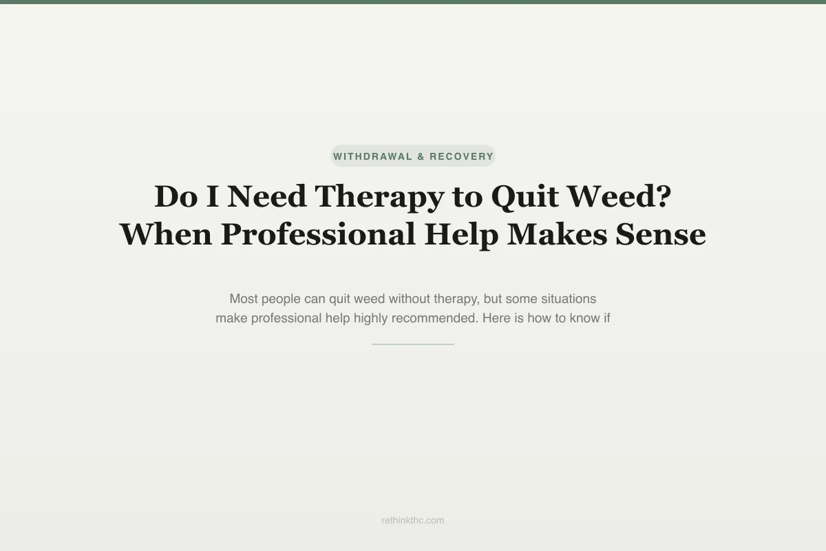 View as imageMost people who quit cannabis do it without a therapist. They set a date, push through the uncomfortable weeks, and come out the other side. That is worth saying clearly because the question "do I need therapy to quit weed" often carries an assumption that quitting requires professional intervention, and that assumption can become its own barrier. If the idea of finding and paying for a therapist is the thing standing between you and quitting, know that many people manage this transition on their own.