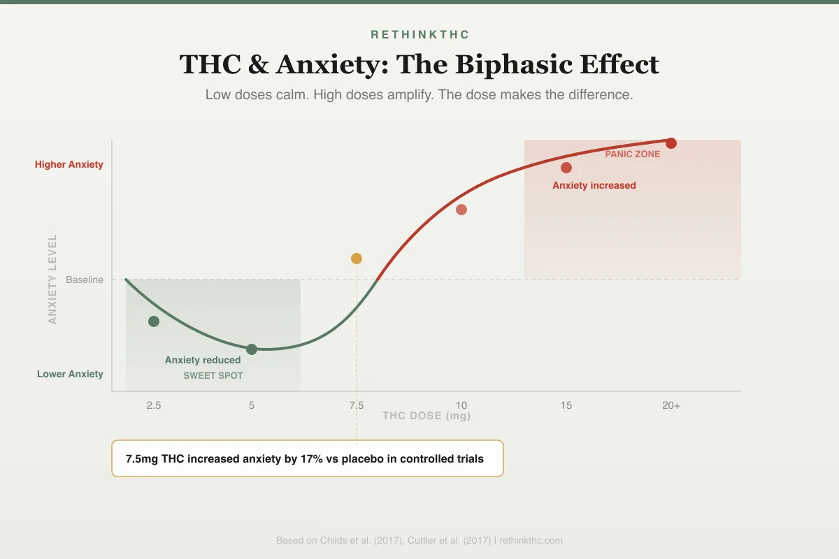 This creates a narrow window. The amount that calms you and the amount that sends you into panic are not that far apart, and the line between them shifts based on your tolerance, the specific product, your mental state going in, and your environment. Anyone who has ever taken one hit too many and spent the next two hours convinced their heart was going to explode has experienced the upper end of this biphasic curve. The biphasic effect explained in detail covers exactly why low doses calm and high doses panic, and what determines where your threshold sits.