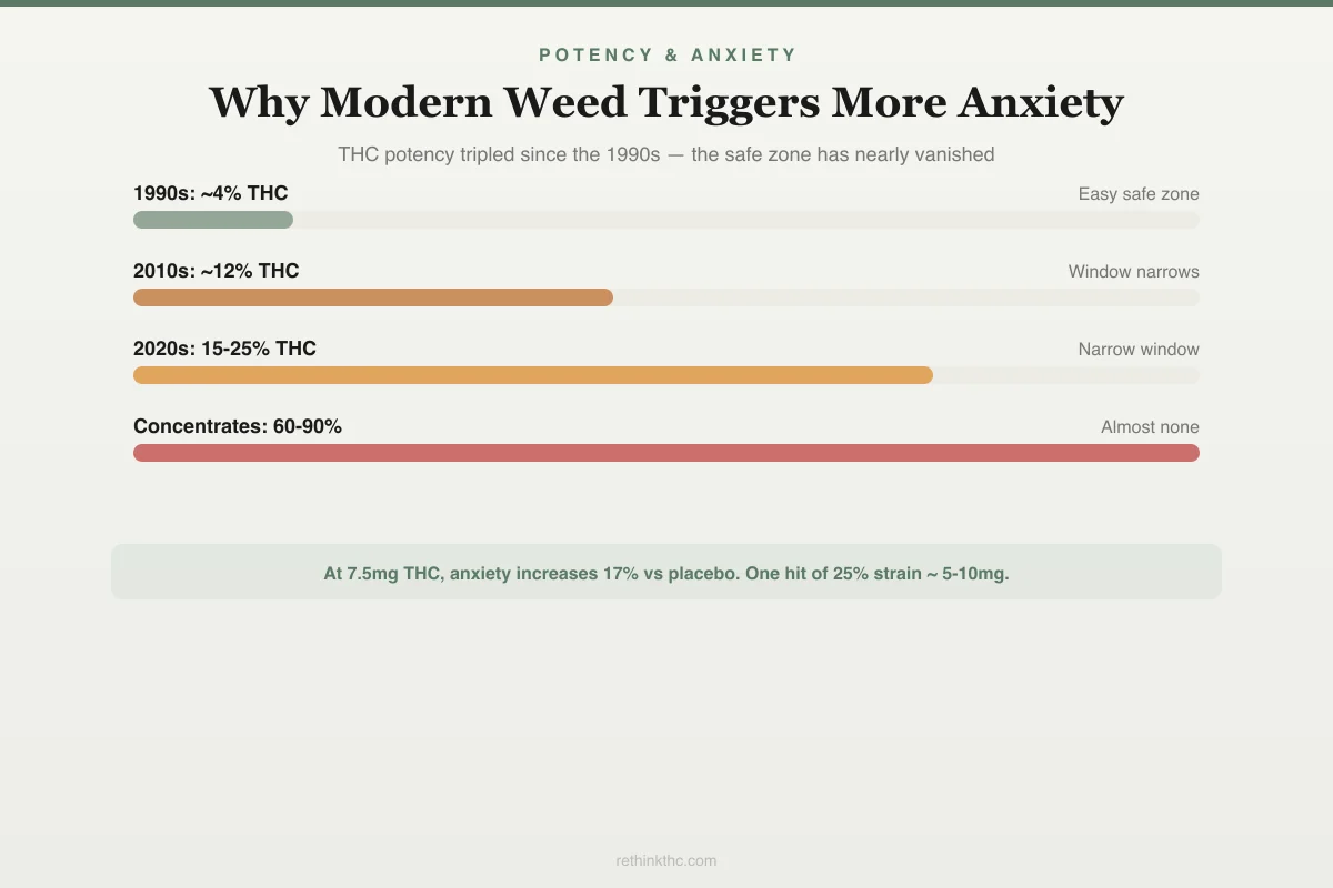 THC potency has roughly tripled since the mid-1990s, shifting the average cannabis experience toward the anxiety-producing end of the dose-response curve.