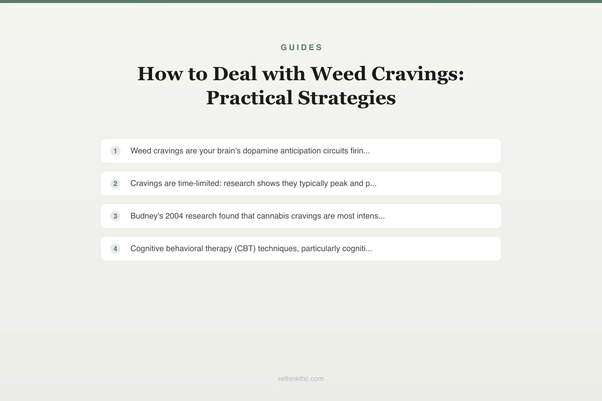 Weed cravings are dopamine anticipation circuits firing in expectation of a learned reward, not a sign of genuine need. Individual craving episodes peak and pass within 15 to 20 minutes, following a predictable wave pattern. Budney's 2004 research found that cravings are most intense during the first week of abstinence and gradually decline over subsequent weeks. The "urge surfing" technique developed by psychologist Alan Marlatt aligns with craving neuroscience: observing the craving rather than fighting it allows the natural wave to complete. CBT techniques including trigger identification, cognitive reframing, and thought records can be practiced without a therapist and have strong evidence for cannabis use disorder. The Delay-Distract-Decide framework provides in-the-moment structure. Environmental trigger management, including removing paraphernalia and disrupting habitual cue-response chains, significantly reduces craving frequency. Persistent cravings that feel like a constant pull rather than passing waves often point to underlying emotional needs that cannabis was addressing.